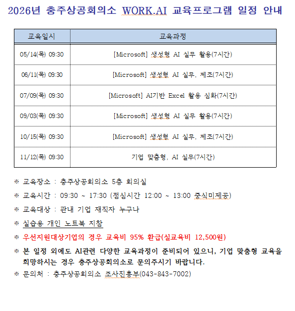 1. 과 정 명 : [Microsoft] 생성형 AI 실무활용 2. 일 시 : 2026. 05. 14(목) 09:30 ~ 17:30 (총 7시간) 3. 장 소 : 충주상공회의소 5층 회의실 4. 교육대상 : 관내 기업 재직자 누구나(선착순 20명) 5. 준 비 물 : 실습용 개인 노트북 지참 6. 신청접수 : 대한상공회의소 WORK.AI 홈페이지 접수 7. 문 의 : 충주상공회의소 조사진흥부(043-843-7002) 8. 비 용 : 실교육비 12,500원(250,000원 선입금, 수료 후 95% 환급) ※ 우선지원대상기업이 아닐경우 환급이 불가능합니다. ※ 일정 인원 충족시 기업 방문형 맞춤 교육도 지원하오니 충주상공회의소로 문의주시기 바랍니다.